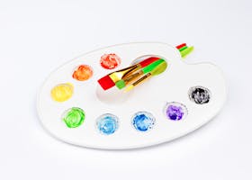 Vibrant artist palette with colorful paints and brushes arranged on a white background.